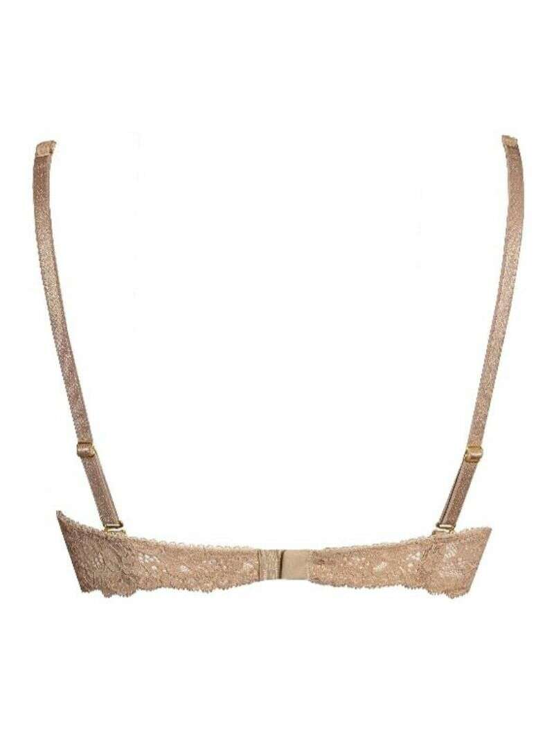 Glæsilegur brjóstahaldari í cappuccino-lit úr mjúku og teygjanlegu blúnduefni. Mjúkir skálar með spöng veita fallegan stuðning og móta náttúrulega, kvenlega línu. Þetta snið sameinar þægindi, rómantískt útlit og fágaðan stíl. Fullkominn með samsvarandi nærbuxum eða sokkabelti úr Cappuccino-línunni.