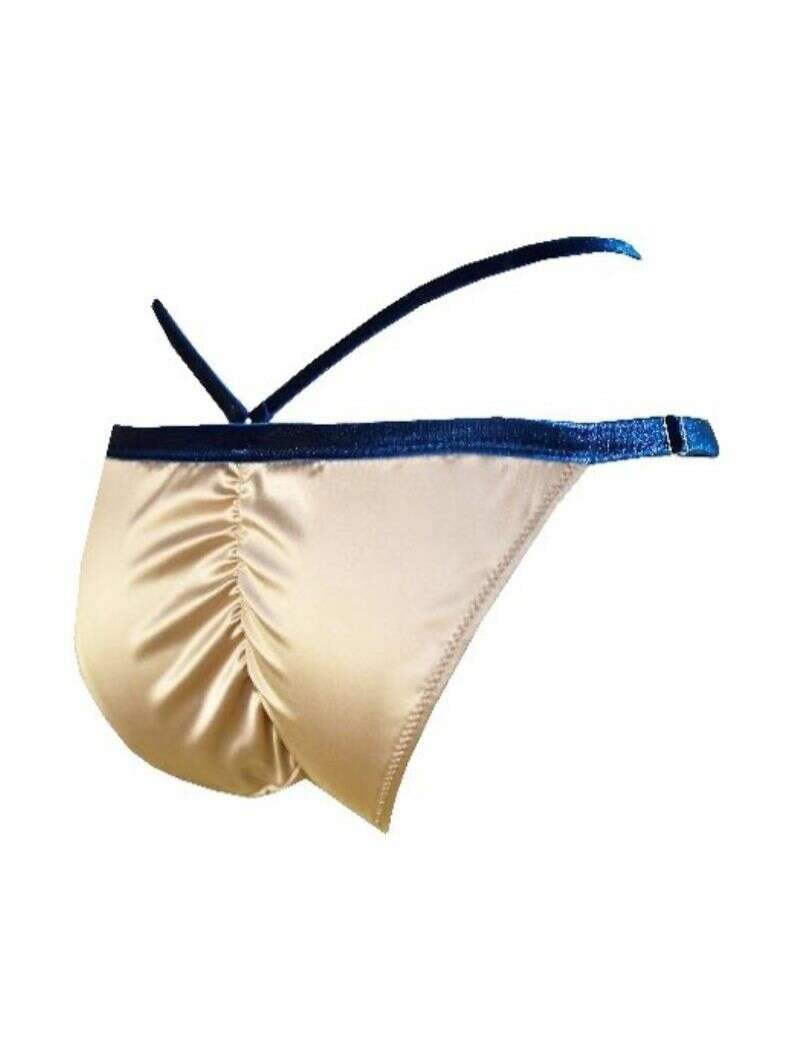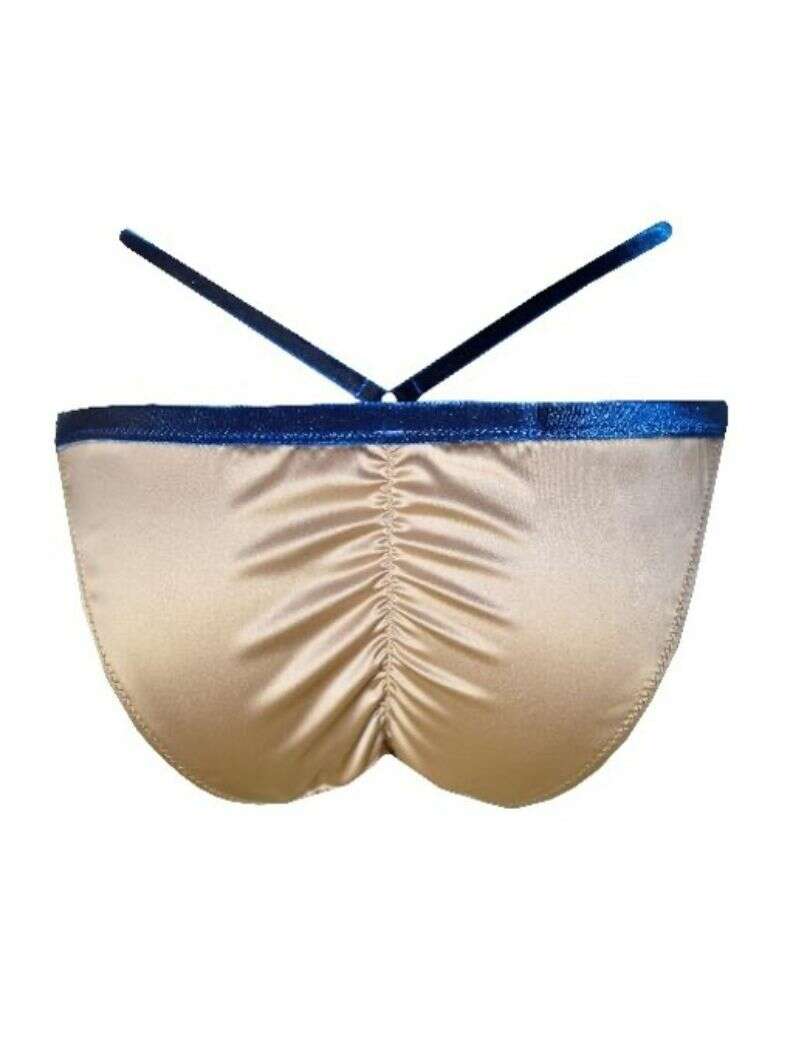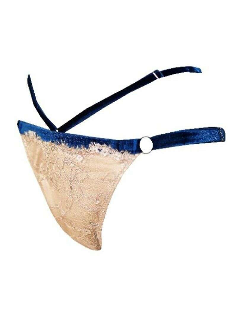 Chicago 2056 eru glæsilegar tango nærbuxur í beige lit úr mjúku satíni og fallegri augnháralíkisblúndu, skreyttar með fallegum bláum flauelskant. Hliðarnar eru með stillanlegum flauelsböndum sem tryggja fallega og þægilega passform. Bómullarfóðruð klofbót. Felling að aftan gefur nærbuxunum fallegra snið og þægilegri aðlögun að líkamanum.